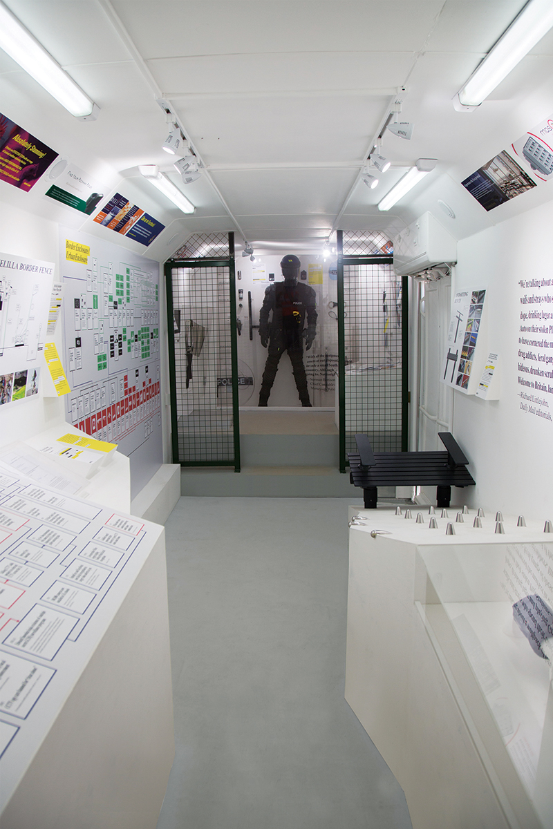 Another video consisted of tools used to kill animals for consumption. We could see how animals were in excruciating pain while these tools were used. It was also clear that workers were unable to use them properly; they were not designed to induce this amount of pain on animals. Also, there was footage of riot police gear with baby blue caps;quite possibly to make them look more friendly for media and viewers. You could also see a plan for the Melilla border fence – a fence built at the border of Morocco and Spain to stop illegal immigration and smuggling. At the top of the caravan you could see many small subvertisements for these tools.