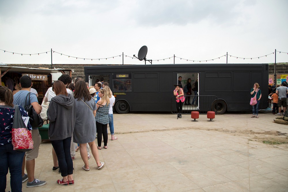 When we visited Dismaland, there was a massive queue; so we decided that we might as well just wait our turn to get in. To make this experience easier and to help pass the time, one of the staffers read excerpts from various books. At one point, there were “lovely” words from a book on the processes of animal testing.