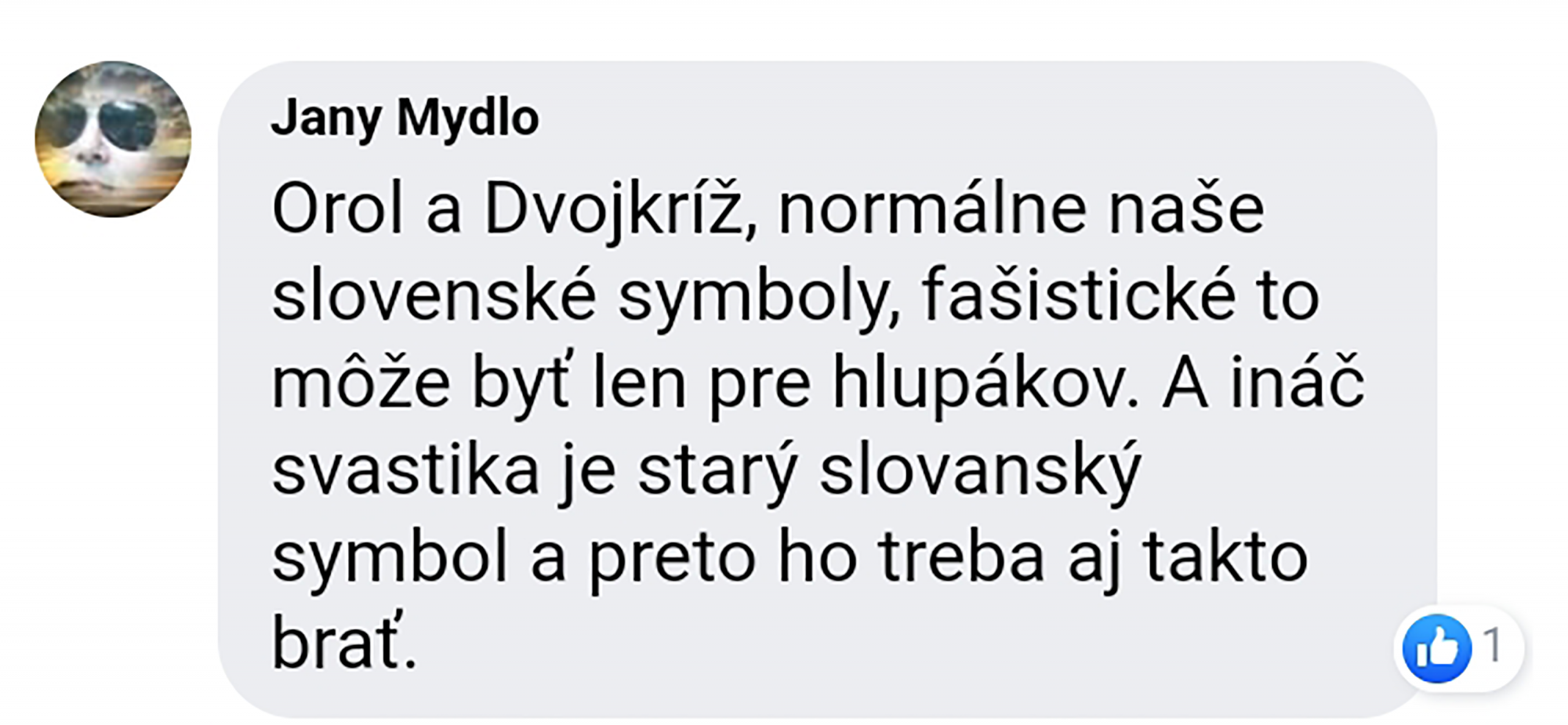 Mr. Mydlo writes that the cross and the eagle are quite common Slavic symbols. What is not far from the truth, but specifically these two symbols used on the poster are associated with fascism and Nazism and not with national pride. Finally, he mentioned that the swastika is also a Slavic symbol and must be perceived. I think this last sentence does not need a comment.