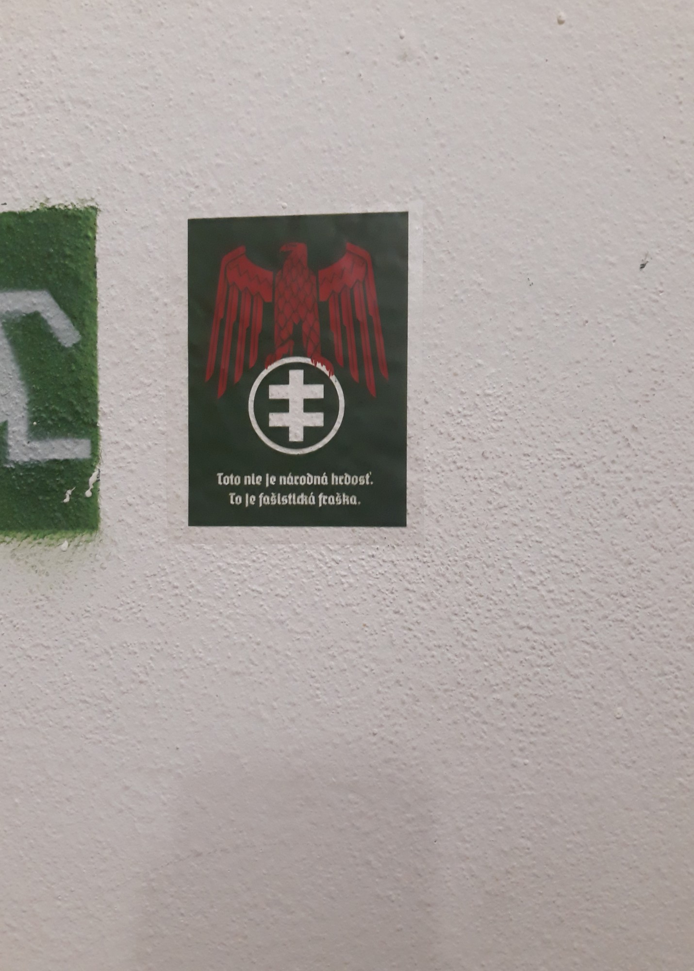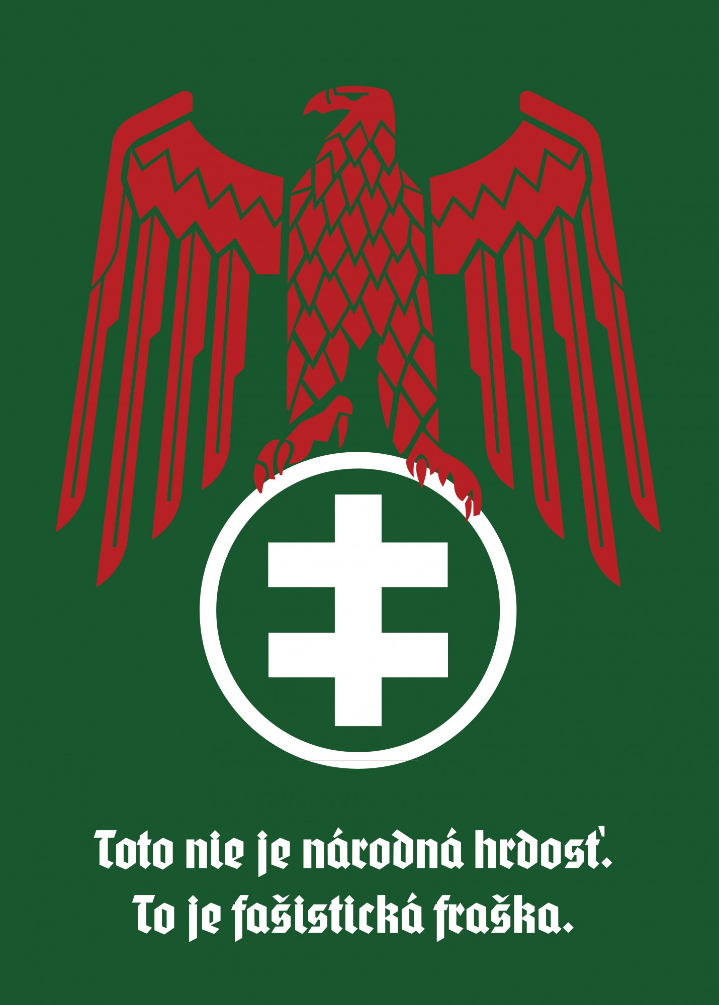 For all that I have described, I decided to respond with my poster. I work in it with symbolism. I used the white cross of the Hlinka guard, which the party used in the past as its logo in conjunction with a green background. I spiced up the whole visual with something I knew would be angry with the party's supporters. I placed a Nazi eagle above the Hlinka guard symbol. By this I wanted to point out that this false national pride is still under fascist ideology. I added this with the text “This is not national pride. This is a fascist farce. ”