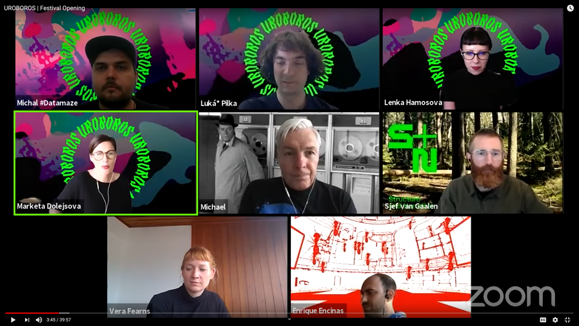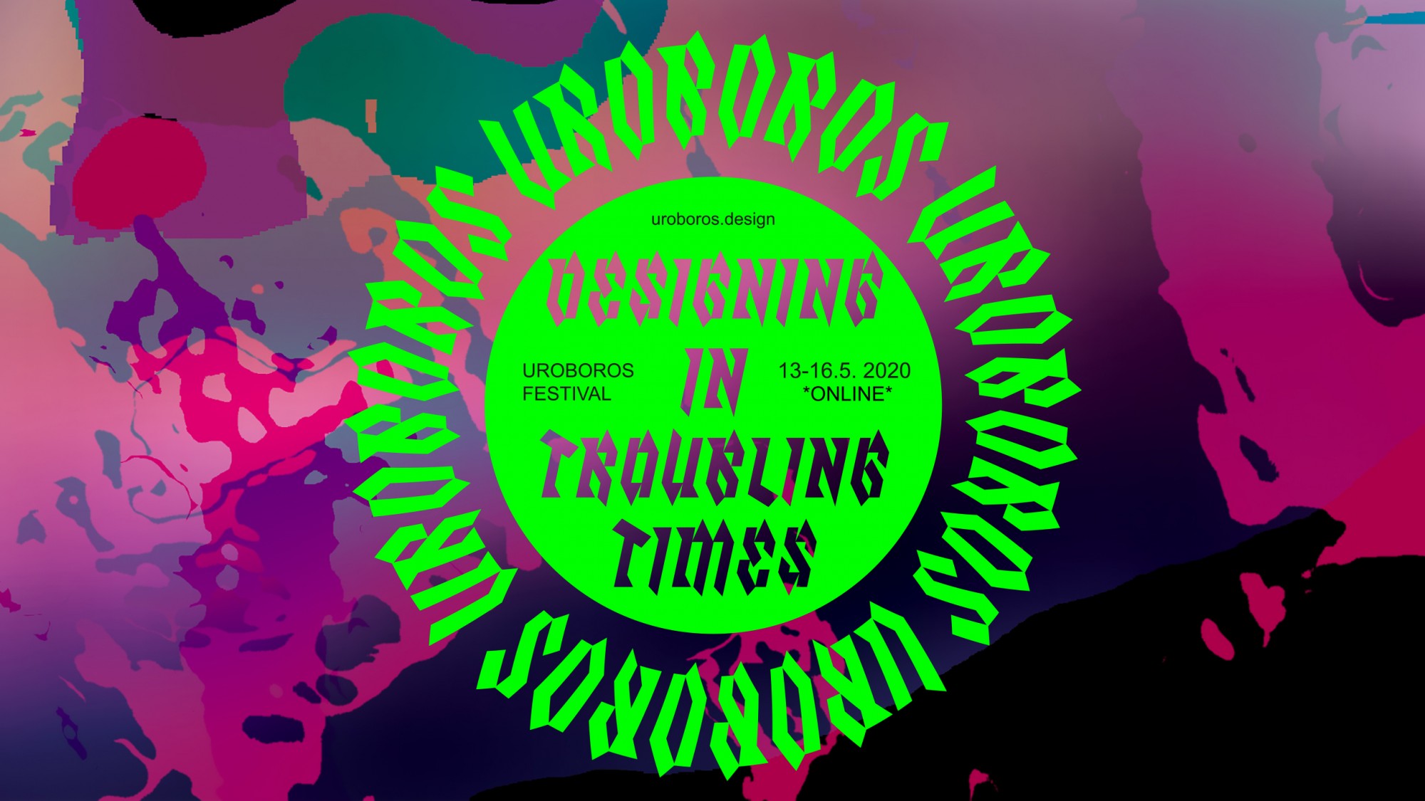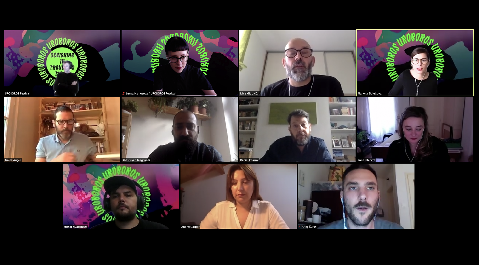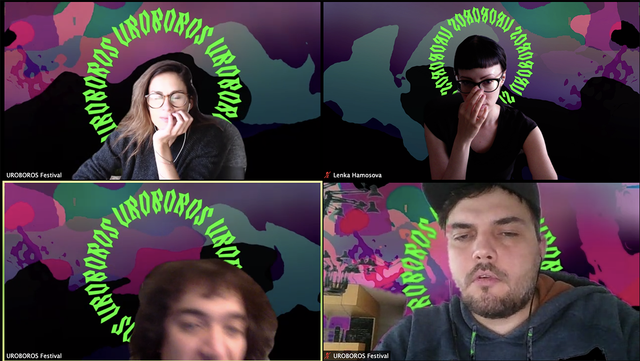 The event was initially planned to take place in DOX - Centre for Contemporary Art in Prague but had to be re-designed into an online format because of the COVID-19 pandemic government measures. This turned out to be a challenging opportunity to test the limits of online festival environments and experiment with new tools for distant collaboration. Amidst these changes, the Uroboros Festival proved to be a unique, free of charge space for designers, researchers, and practitioners from all over the world to join discussions and participate in critical co-designing. The festival was fueled by a hefty dose of enthusiasm in experimental design explorations and created new international connections; leaving a healthy appetite for next year's Uroboros rotations.