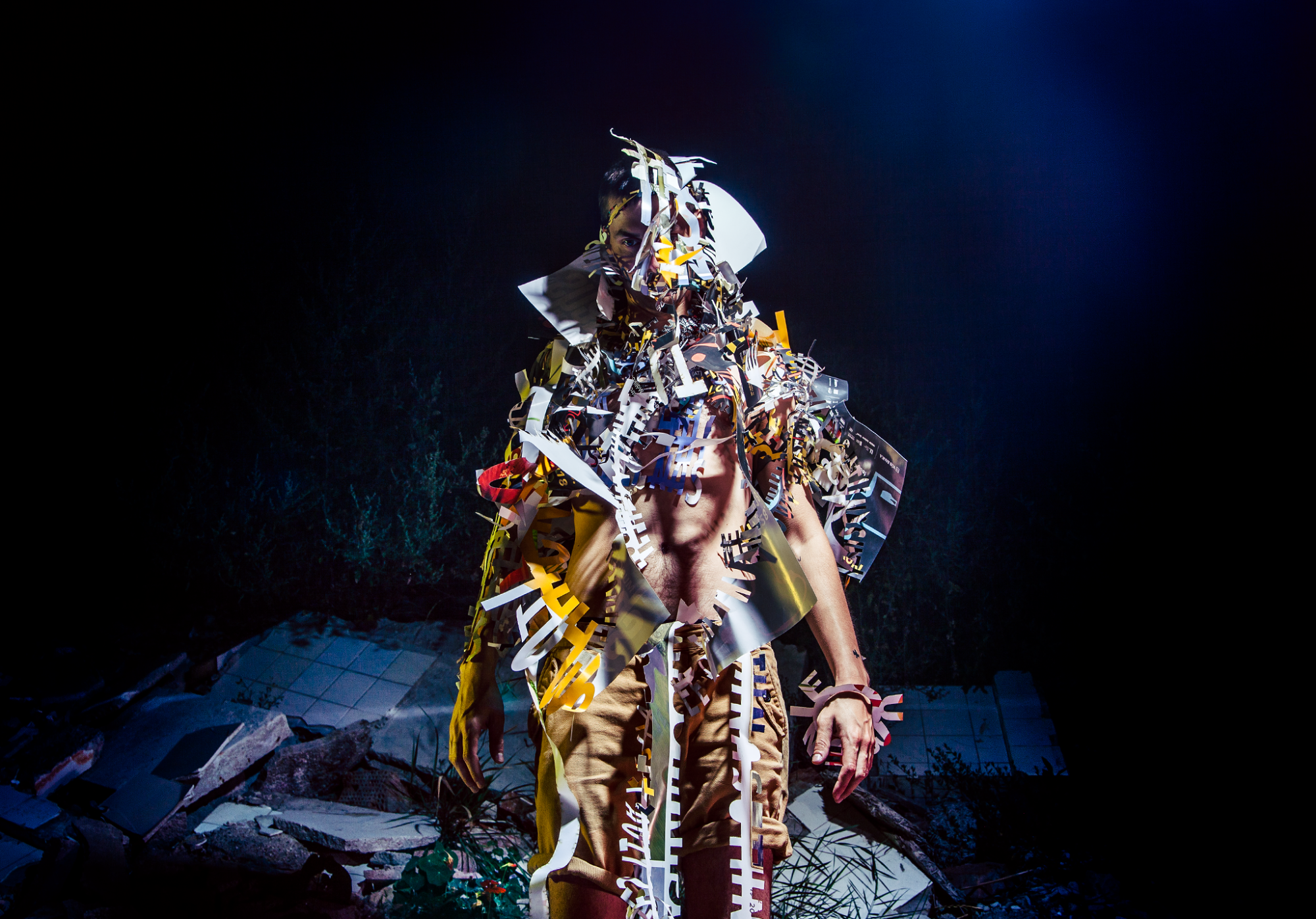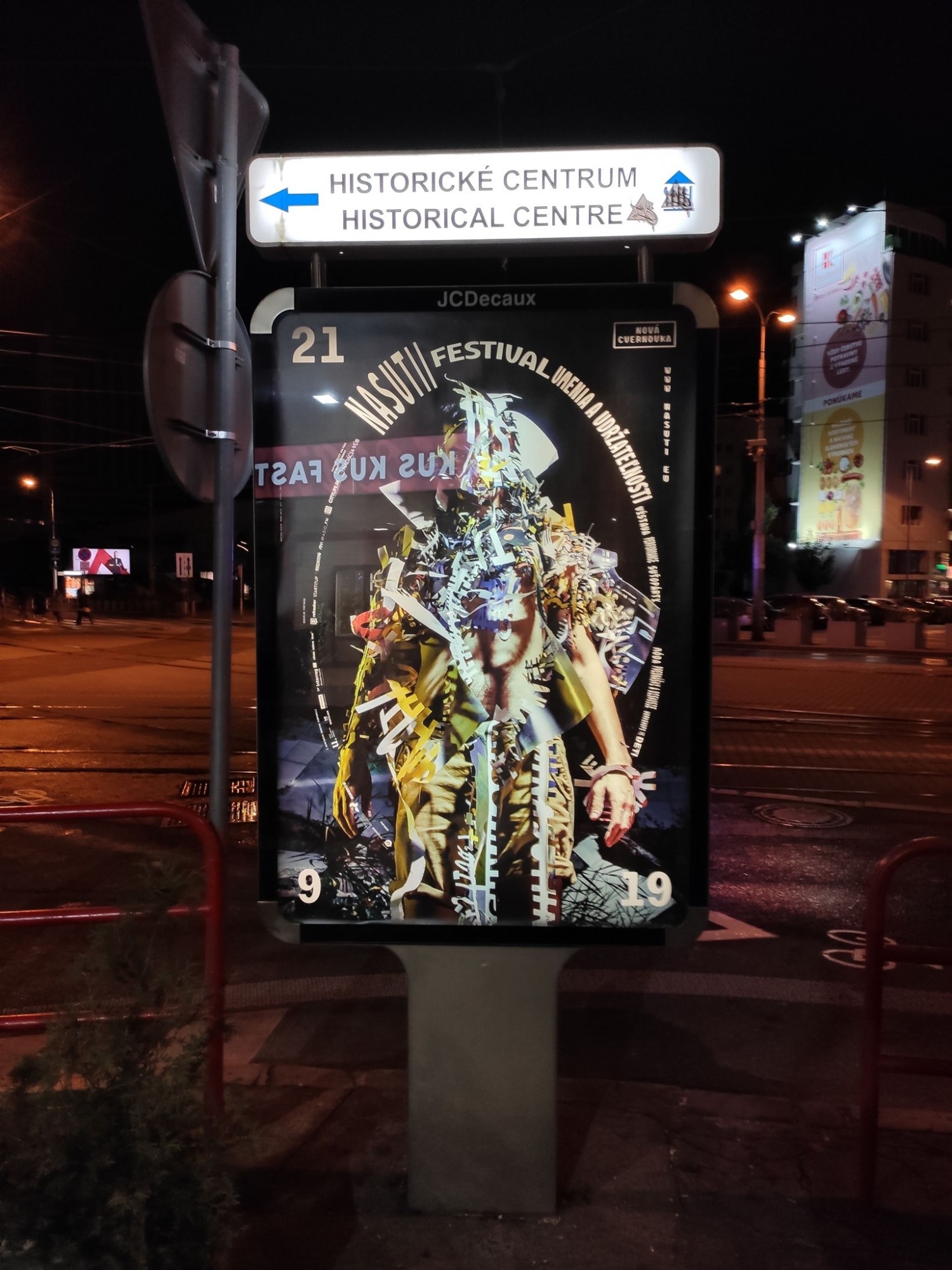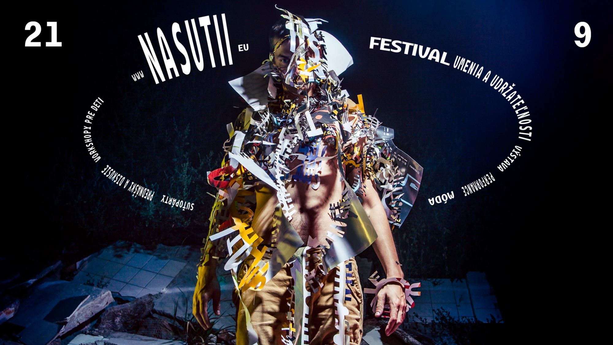 Graphic design was an integral part of the festival’s concept and was created “in-house”. Nova Cvernovka-based graphic designer Braňo Matis used circular motif of texts that was directly corresponding with the cover photo. The model is "wearing" cut-out paper texts that were produced from recycled posters. The circle may also refer to circular economy - which should however not be just a greener alternative to more and more production. The goal of this festival and all its components is to push the thinking towards responsible art and life.