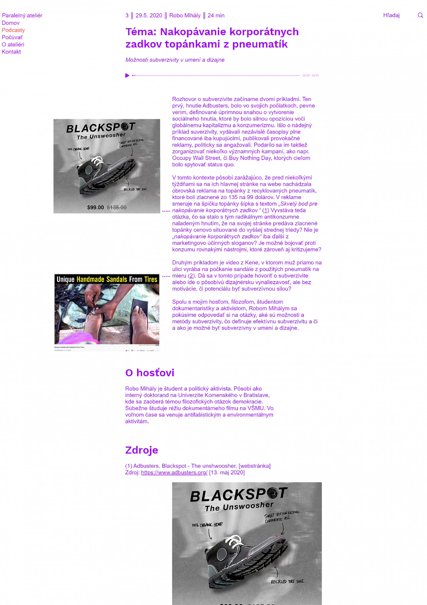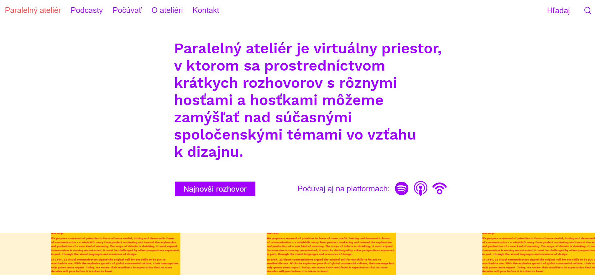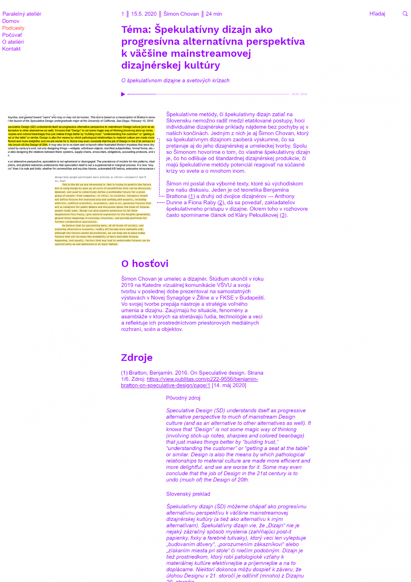 Paralelný ateliér (Parallel Studio) is published in the form of podcasts, which you can find on the website www.paralelnyatelier.sk and on podcast platforms (spotify, podbean, apple podcasts...). The project was created as a diploma thesis at the Department of Visual Communication AFAD and currently has finished the first phase of 10 podcasts. With interesting guests we opened the topics of speculative design, the relationship between design, advertising and capitalism, ideologies in design, digital revolution, climate crisis, critical design and many more. We are currently working on the second stage of the project, which should take place in the first half of 2021.
