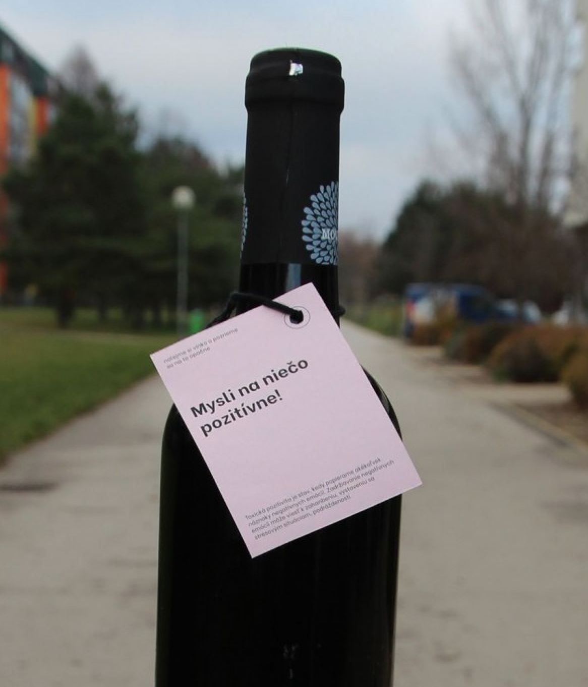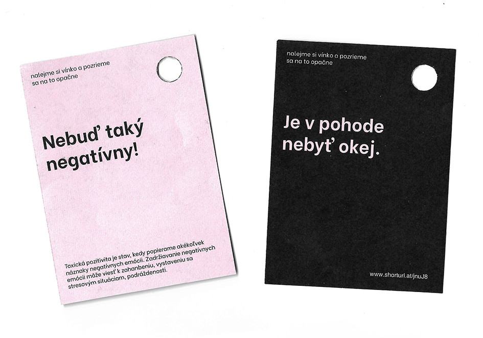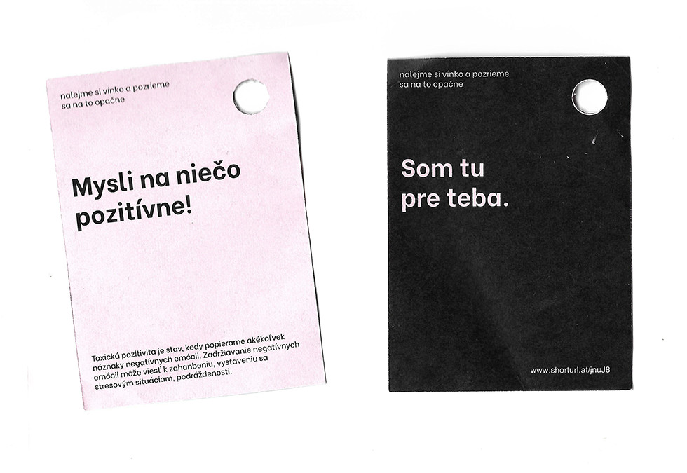 The whole idea is about helping people understand that there’s something like toxic positivity and that it can affect us. You can choose one of these cards, pin it on a bottle (the best is a wine bottle), and give it to a person who exhibits certain signs of toxic positivity or who deals with negative emotions.