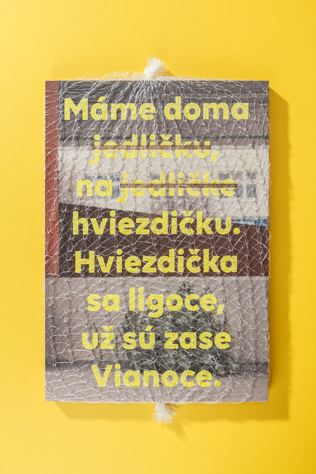 The yellow colour of the cover text was chosen due to its non-association with Christmas, as was the transfer paper, Yellow Creative Board (270 g/m2), and the thread used to stitch the binding. The book contains 56 pages in A4 format, which are printed on SH Recycling paper (140 g/m2). Digital printing on this type of paper created a subtle randomness that affects the quality of the photographs, which was the author’s intention. This small incomprehensibility amplifies its meaning. The book is wrapped in the same kind of plastic netting used to wrap Christmas trees.