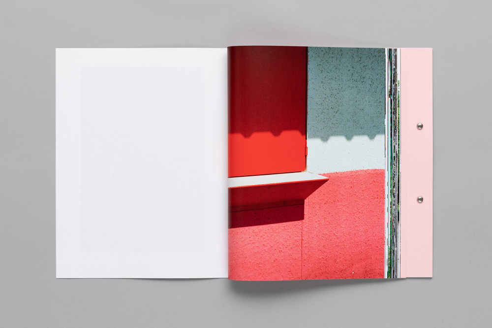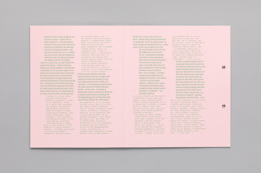 The second way of browsing — when it’s fully open in landscape format — is a slow walk, relaying detailed perceptions and observations. The accompanying text is arranged in irregular paragraphs to evoke the liveliness of the urban structures. It represents different periods of time layered in the architecture and design of public spaces. The glossy title references sign paintings or objects in the streets. Palečková uses several typefaces: Velvetyne Type Foundry, Setup, Grilli Type, Martin Pyšný — to stress the different, overlapping strata of the city, functioning as a palimpsest of posters, signboards, and other more abstract elements.