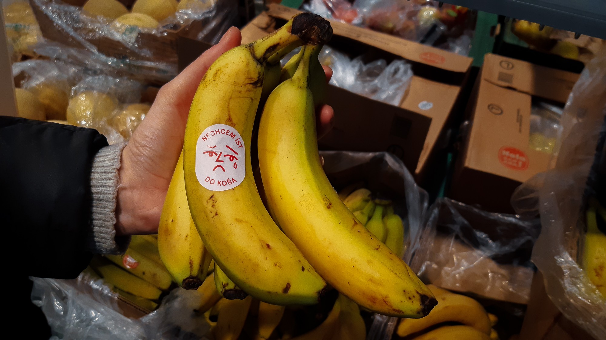 Each sticker contained a visual of a cute face, along with a quote. I find that visualising emotions is a good and playful way to reach people. The shopper who spontaneously grabs a piece of fruit could then read the message and think about it. The quotes on the stickers said: