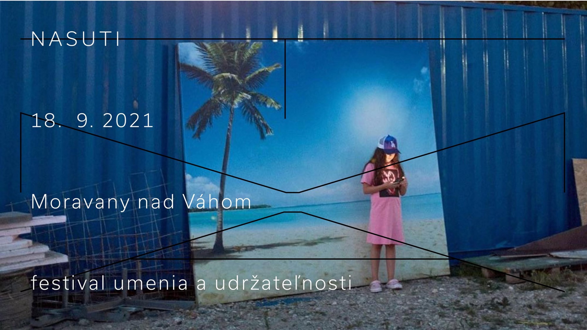 For the festival’s communication design, curators Zuzana Duchová and Diana Klepoch Majdáková, together with graphic designer Peter Liška, decided to reuse two photographs from previous editions. Using these existing photos for the posters is also an act of saving, of not inducing more and more production and energy usage. Both of the images depict natural light/darkness in combination with artificial light, carrying a disturbing message. The photo by Matej Hakár from 2017 was taken in an undefined suburb. It shows a girl absorbed by the light of her phone, standing next to a steel panel on a construction site, directly in front of a large canvas with an idealistic image of a beach. A strange scene that can be read as a metaphor of Western society — desiring a beach paradise but actually looking in a different direction.