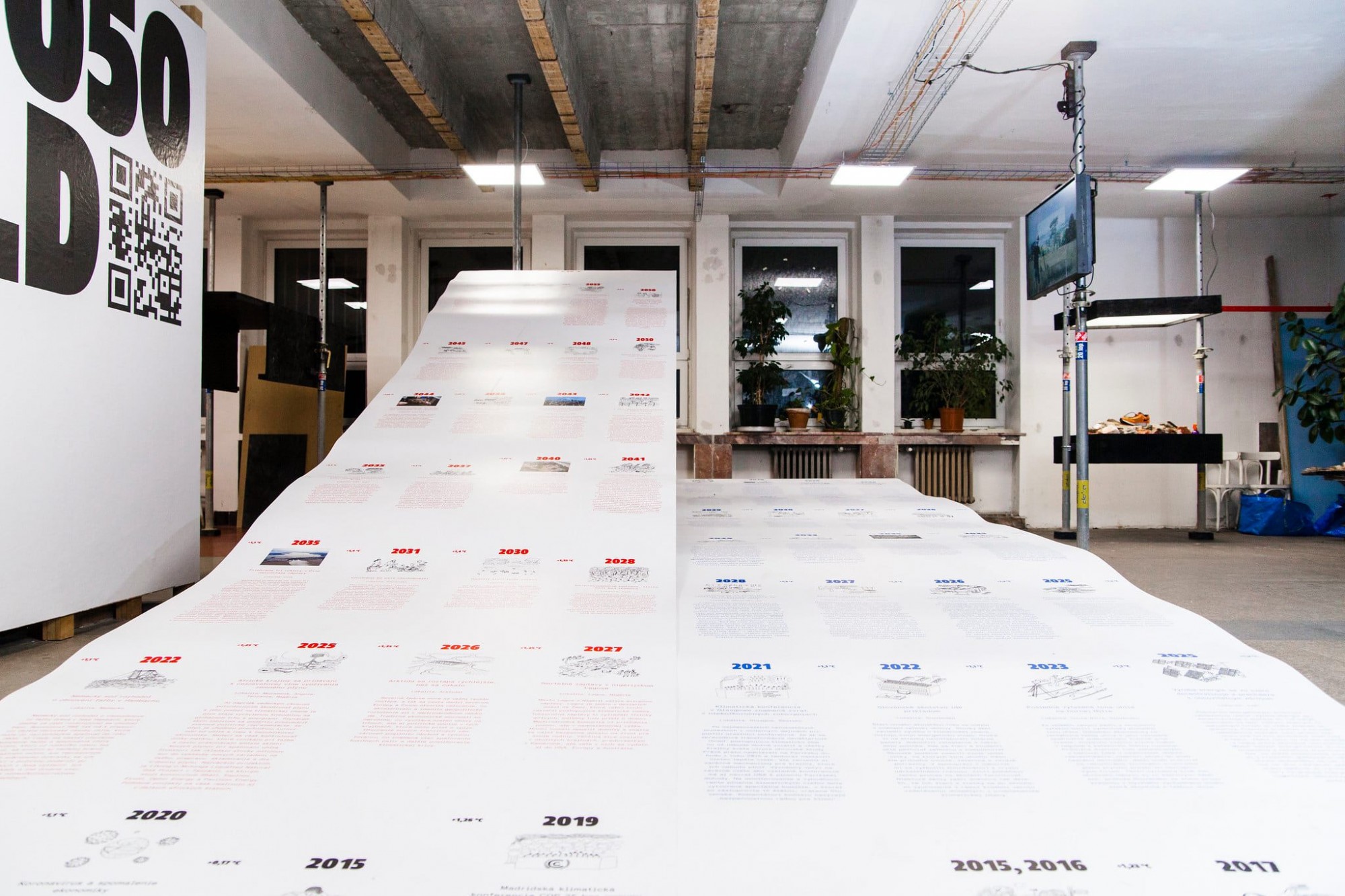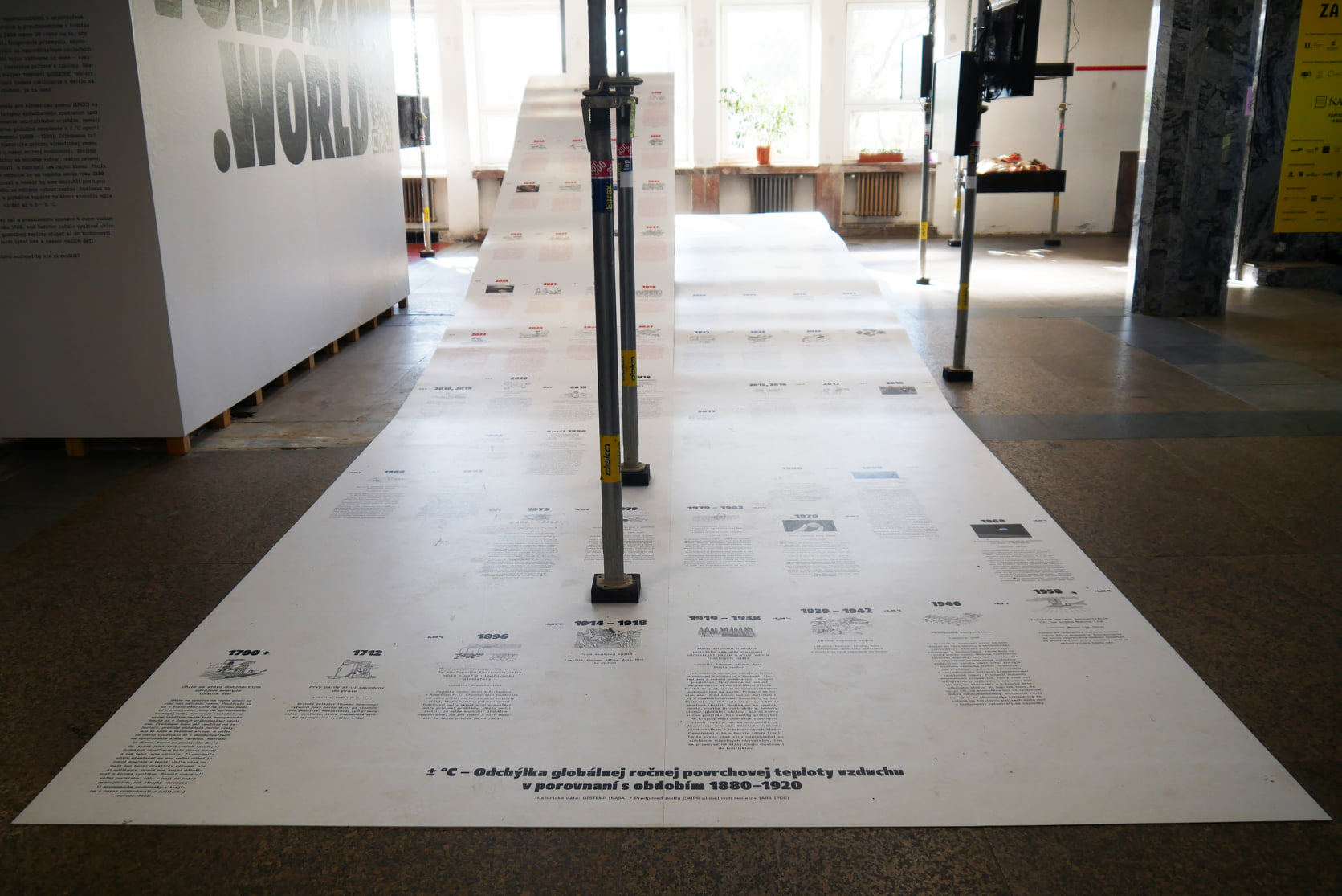Volba2050.World [Choice2050.World], explores different ways of reading the displays and acknowledges the different intellectual equipment of each visitor. You can walk past the presentations in a few seconds and still capture the main idea; you can start, leave, and come back again, layering your perceptions in parallel with the layering of the exhibition by the exhibition designers: Peter Liška, Boris Meluš, and Ľubica Segečová. Joined by certain professionals who are passionate about climate issues, such as filmmaker Eva Križková and activist Lukáš Osvald, the various entries are inspiring. Environmental challenges await us — whether we confront them or want to pretend they do not exist.
