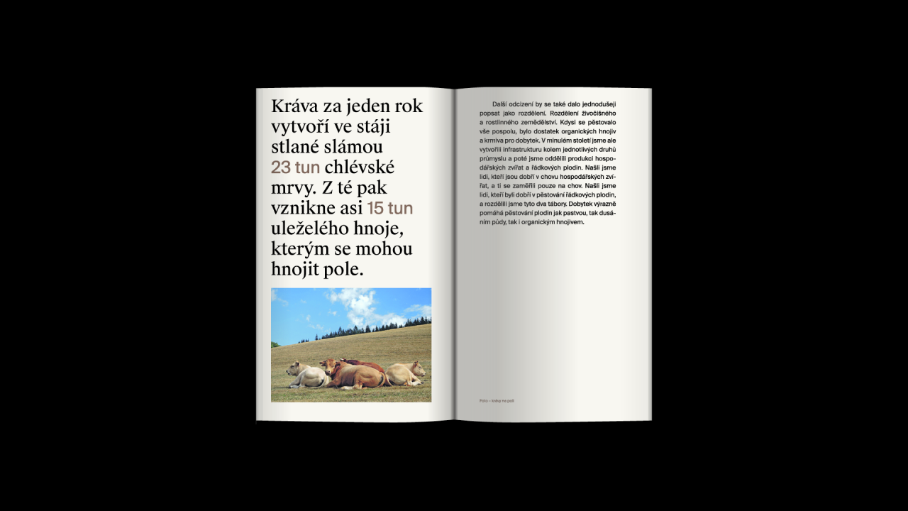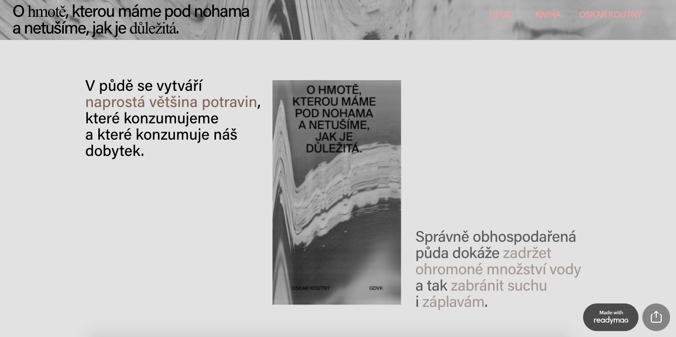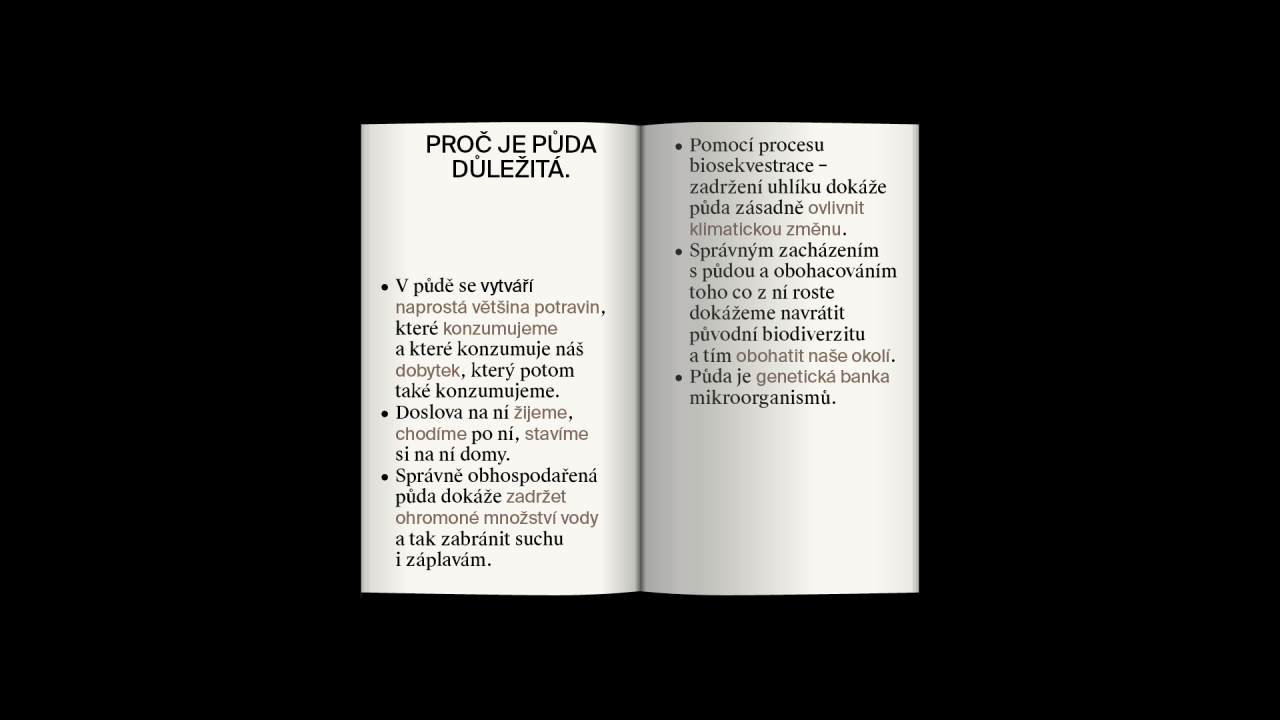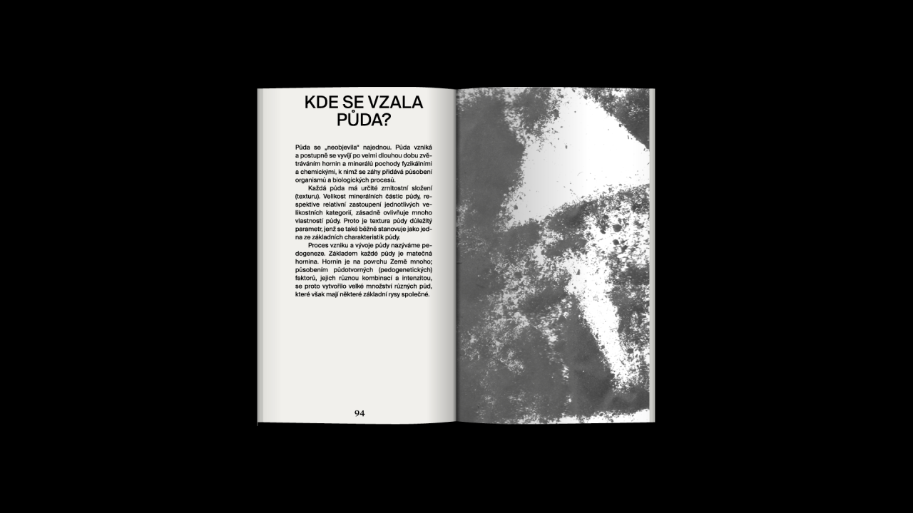 The project O hmotě, kterou máme pod nohama a netušíme, jak je důležitá [About the matter under our feet and that we have no idea how important it is] deals with this topic, whose author is Oskar Koutný. In this publication, Koutný reveals the research and points out the problem. It was produced last year in the graphic design and visual communication studio at UMPRUM in Prague.